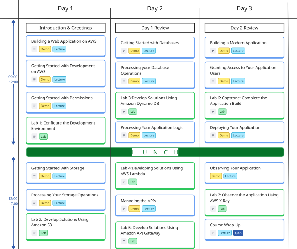 The official certified course Developing on AWS is a 3 days course offered by AWS, includes lectures, demos, and labs.