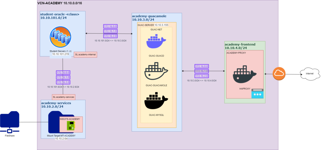 - academy-guacamole: 10.10.3.0/24 – guacamole tiers (guacd, mysql, guacamole) -private