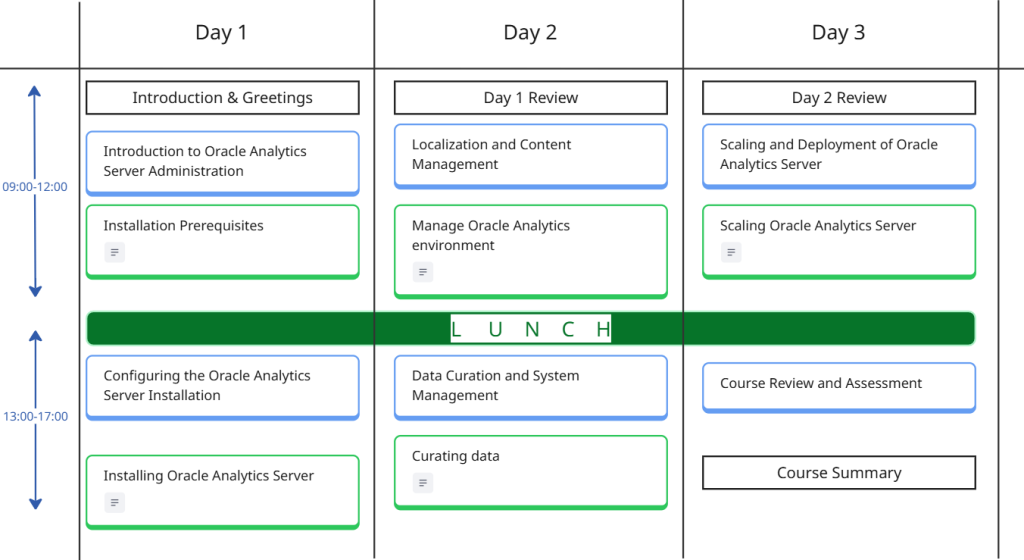 The Oracle Analytics Server Administration Course is a 3 days course, includes lectures, demos, and labs.